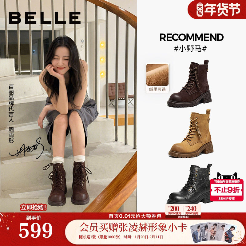 百丽靴子英伦风冬季新款粗高跟羊皮短靴加绒厚底马丁靴3NW40DD