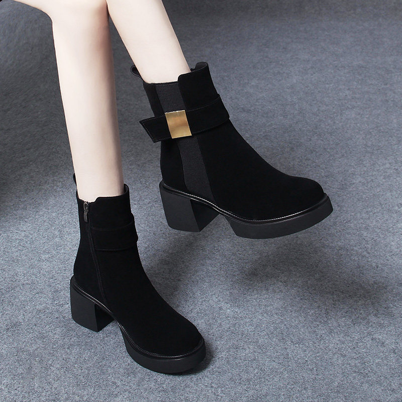 2025冬季新款厚底高跟鞋粗跟绒面短靴女靴子羊皮女靴软加绒马丁靴