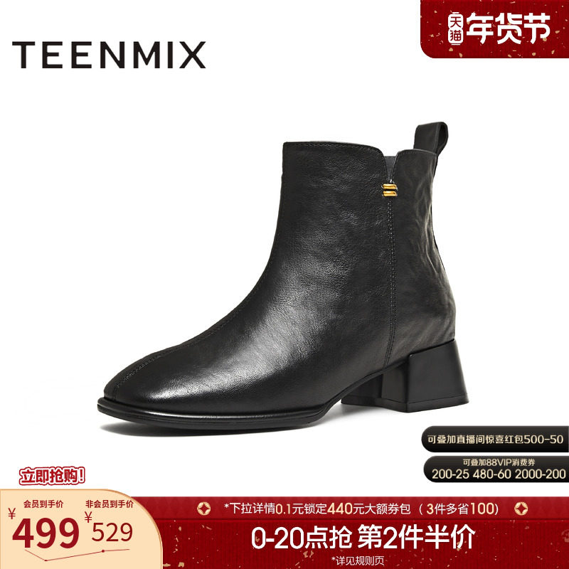 天美意方头粗跟厚底时装靴短靴女高跟鞋皮靴子2025冬新款BL991DD5