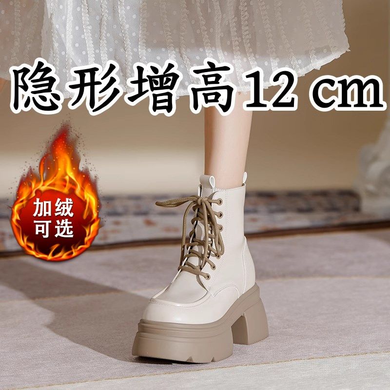 爆款米白色9cm小个子内增高马丁靴女英伦风真皮短靴厚底高跟靴子