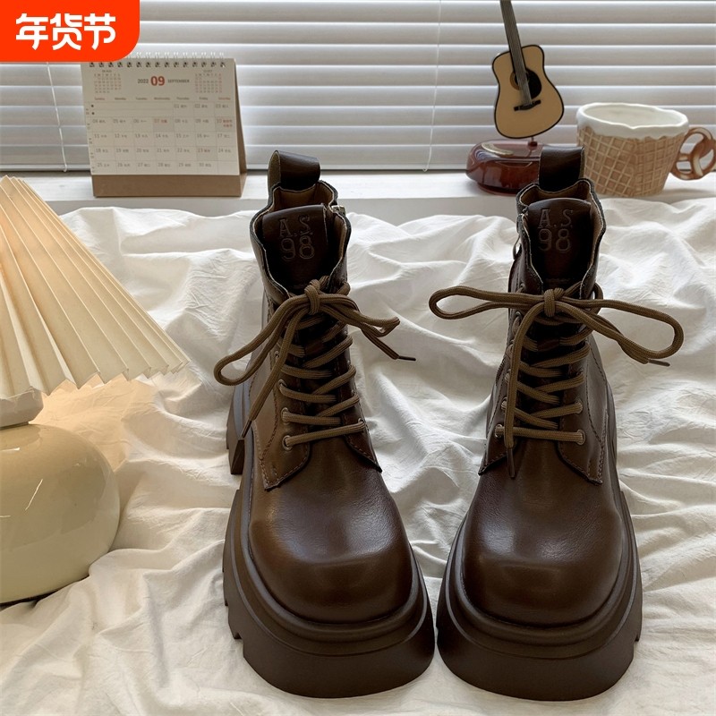 棕色美马丁靴女2025春秋季新款英伦风小个子增高厚底短靴高跟中筒