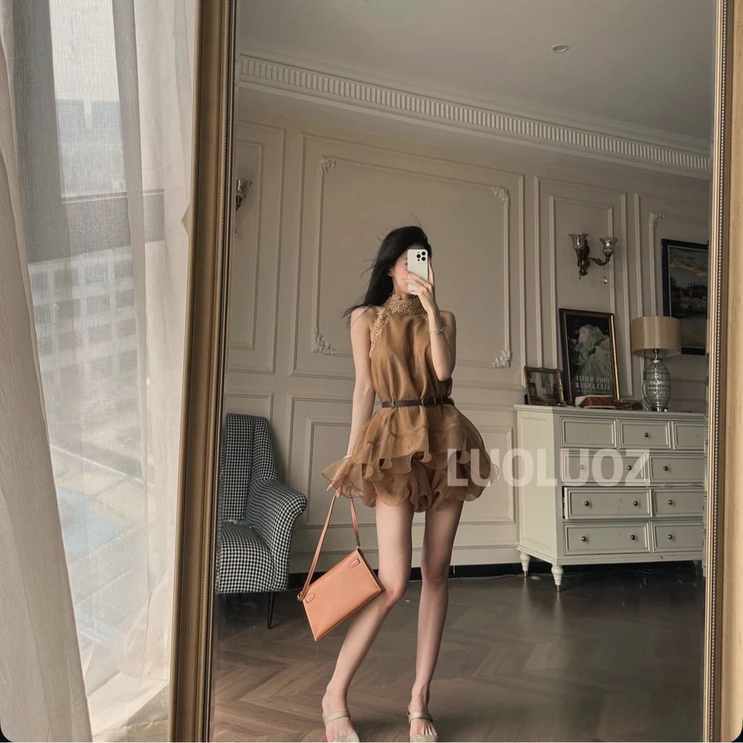 甜梨呆呆美和莉穗堆叠木耳边挂脖上衣多层蕾丝网纱蛋糕短裤两件套