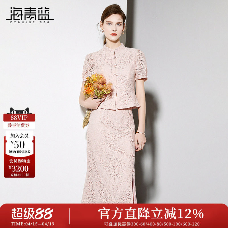 海青蓝新中式旗袍套装裙2026夏季新款盘扣上衣包臀半裙蕾丝两件套