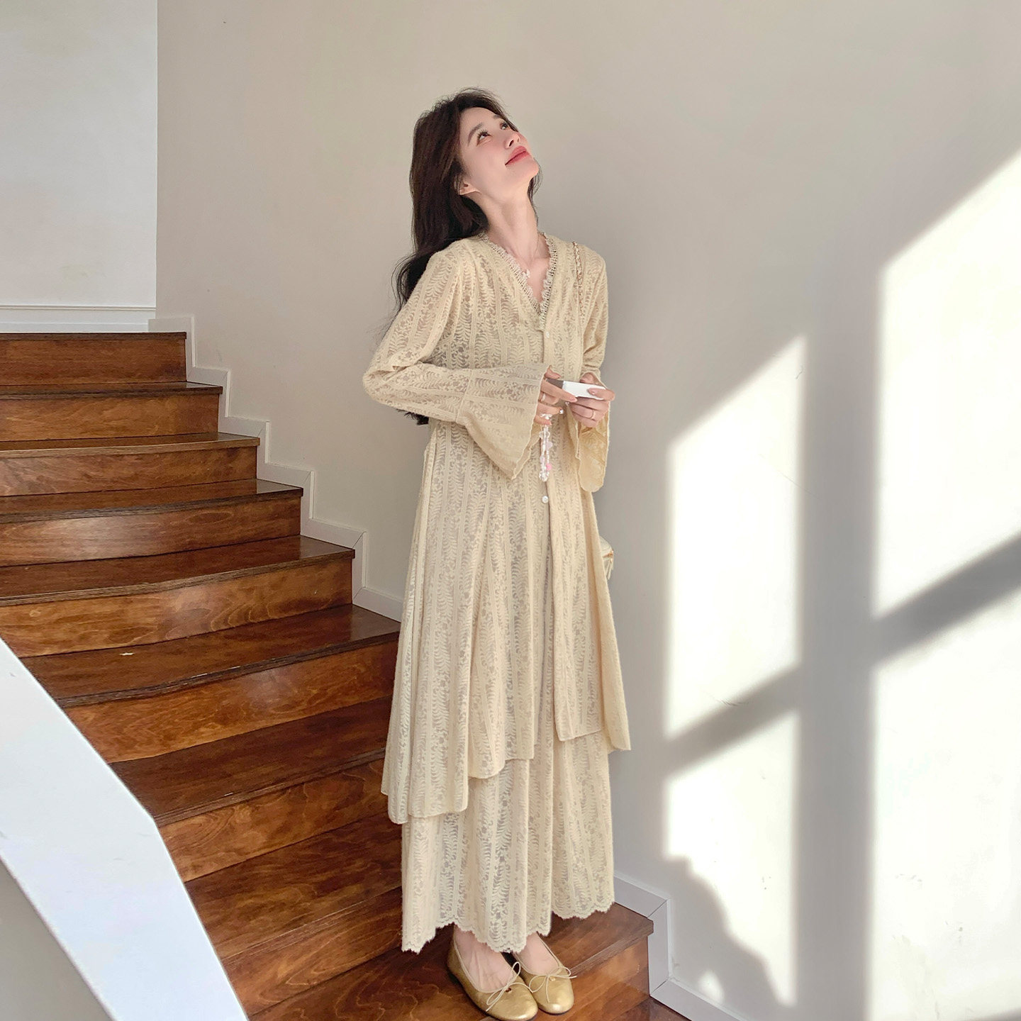 荔桃想睡觉ya【蜜桃恋人】纯欲蕾丝拼接吊带连衣裙开衫外套两件套