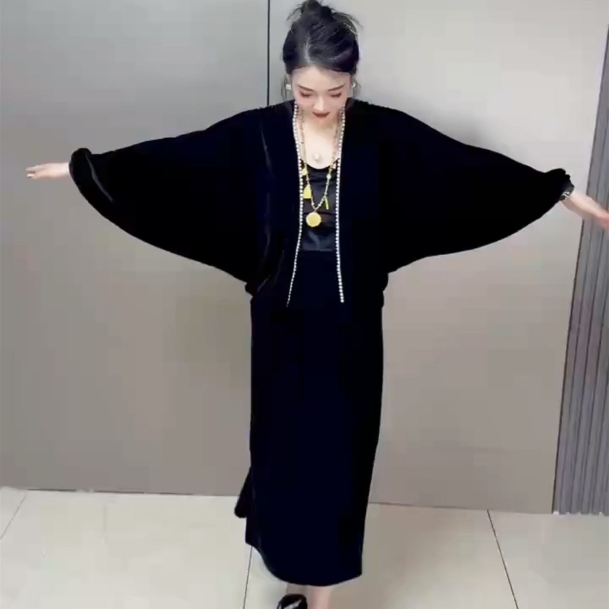 欧货秋季新款女装重工钉珠黑色丝绒宽松长袖蝙蝠衫外套时尚百搭潮