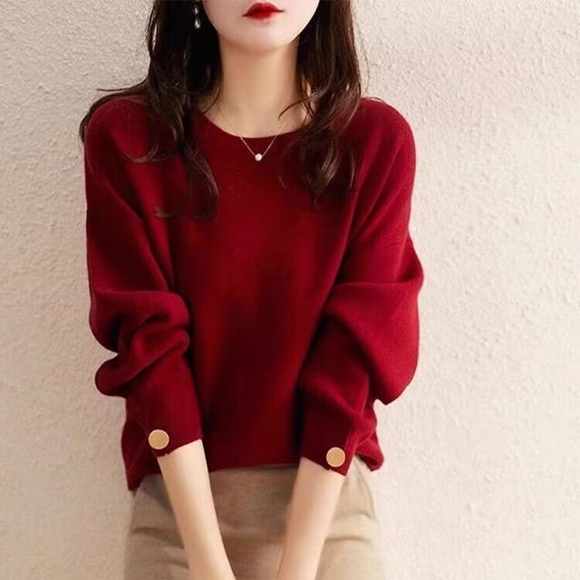 女装2023秋冬新款长袖圆领宽松套头外穿百搭红色针织蝙蝠衫上衣潮