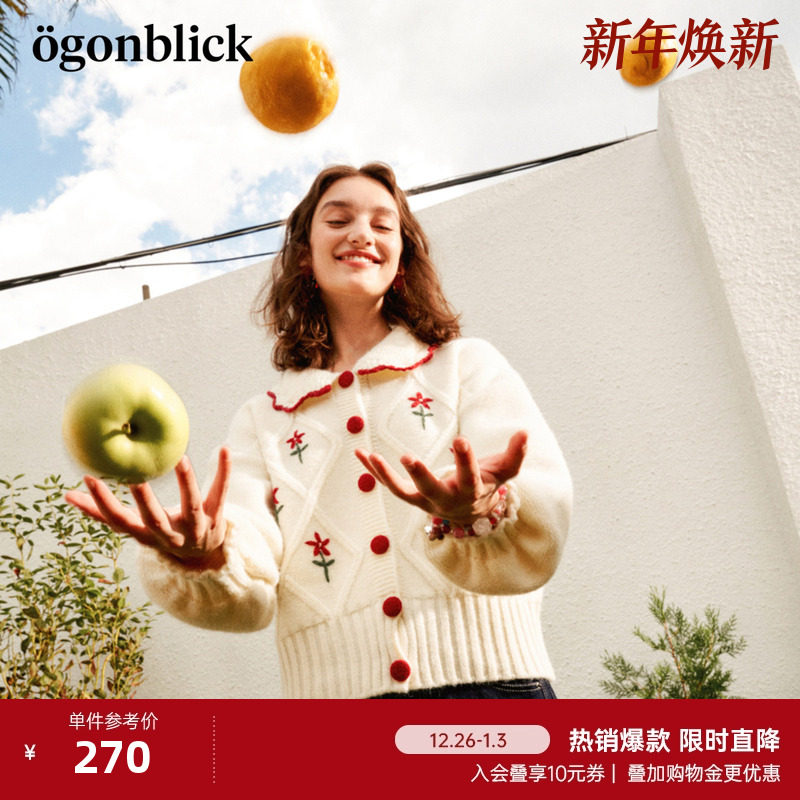 北欧时刻日系提花娃娃领杏色毛衣女秋冬新款慵懒百搭针织开衫外套