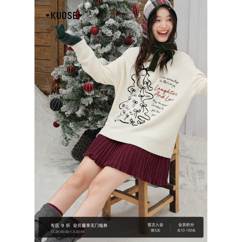 阔色杏色圣诞树刺绣毛衣内搭女2025秋冬季新款氛围感搭配针织衫