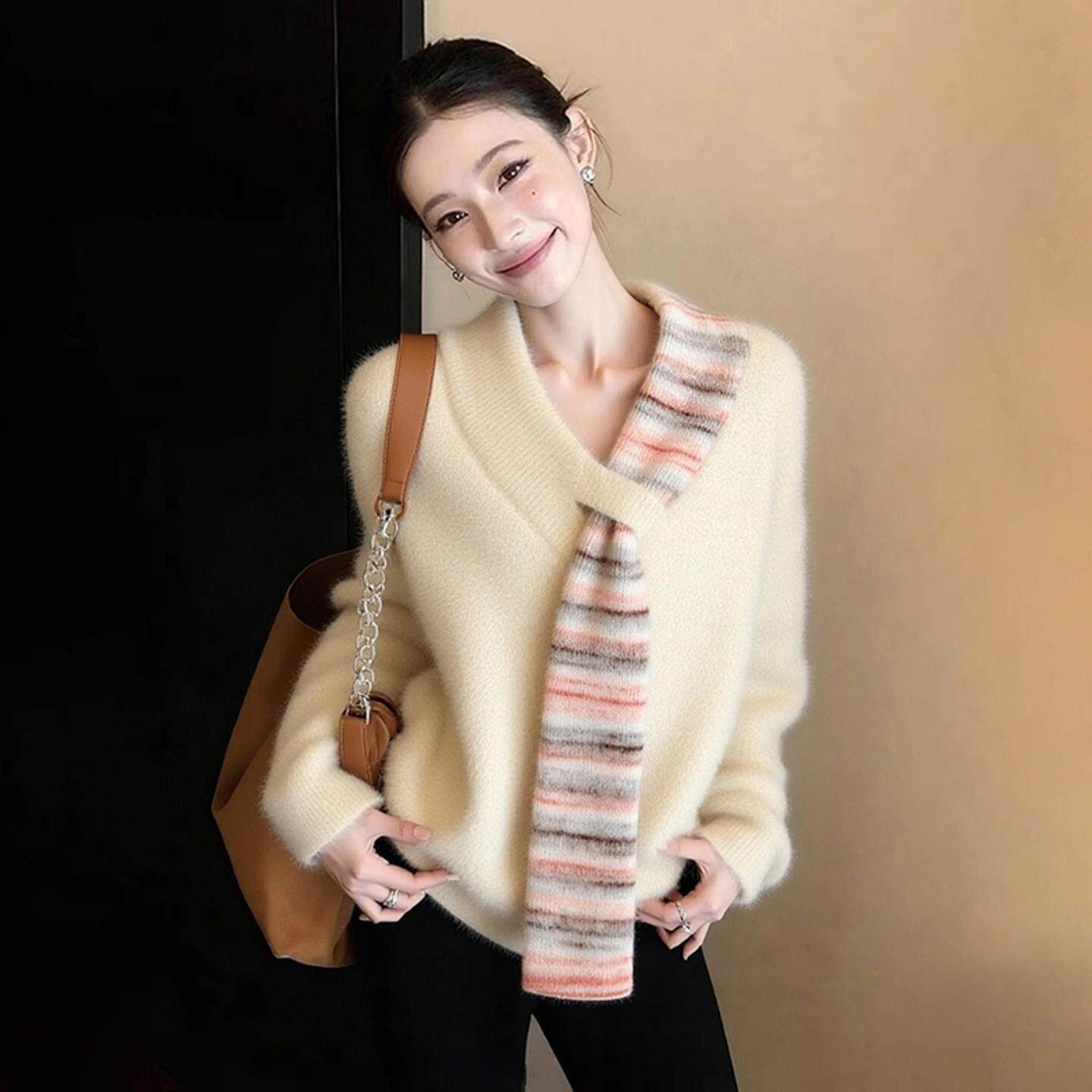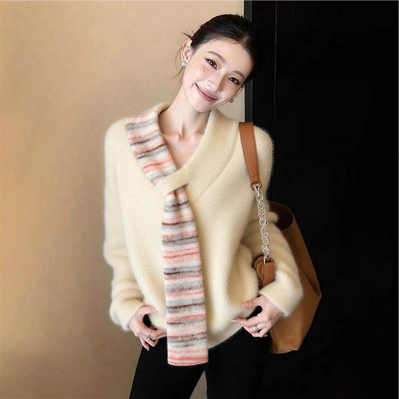韩系v领奶杏色毛衣女秋冬季软糯温柔风宽松慵懒风针织衫内搭上衣