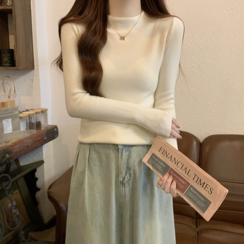 春秋薄款半高领百搭修身长袖针织衫上衣秋冬内搭杏色毛衣女打底衫