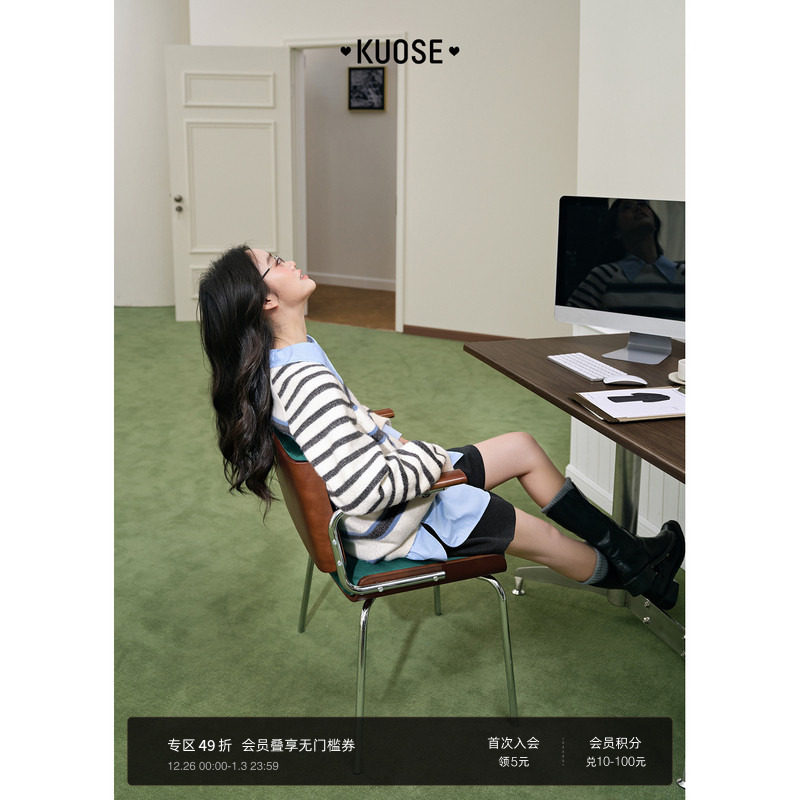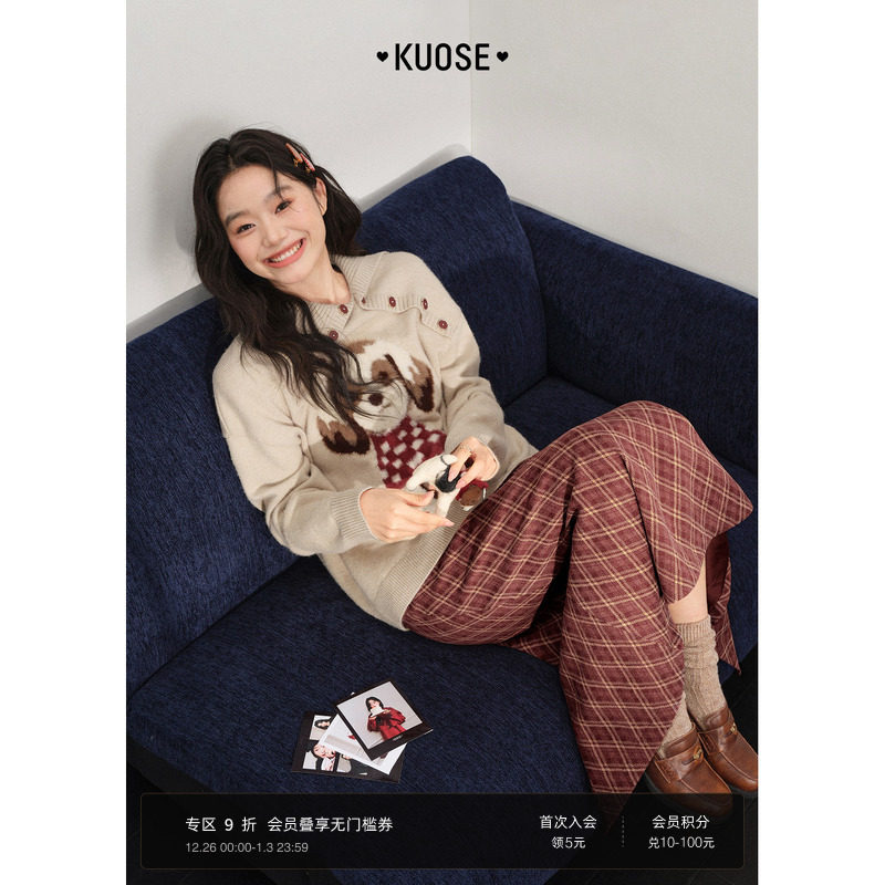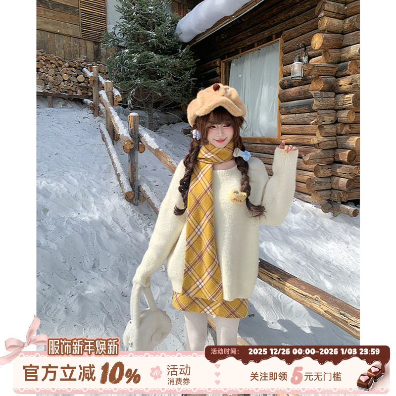 织物猪 小冻熊 宽松慵懒风奶fufu杏色毛衣女秋冬复古棕格纹短裙