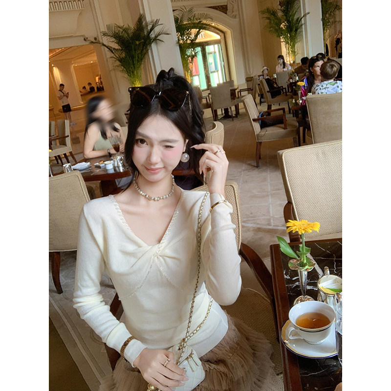 龙妹家杏色V领蕾丝打底衫女装内搭2025秋冬新款修身毛衣针织上衣