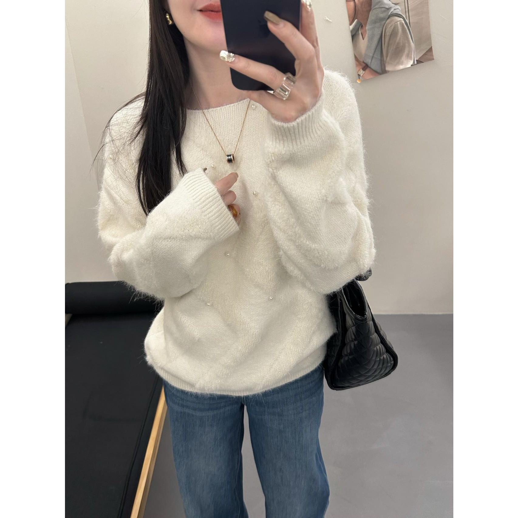 超好看杏色毛衣女秋冬2024新款慵懒风软糯宽松圆领钉珠针织衫上衣
