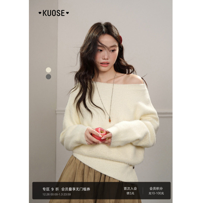 织物猪 雪绒小熊 甜欲风奶fufu一字肩杏色毛衣女秋冬保暖毛织上衣