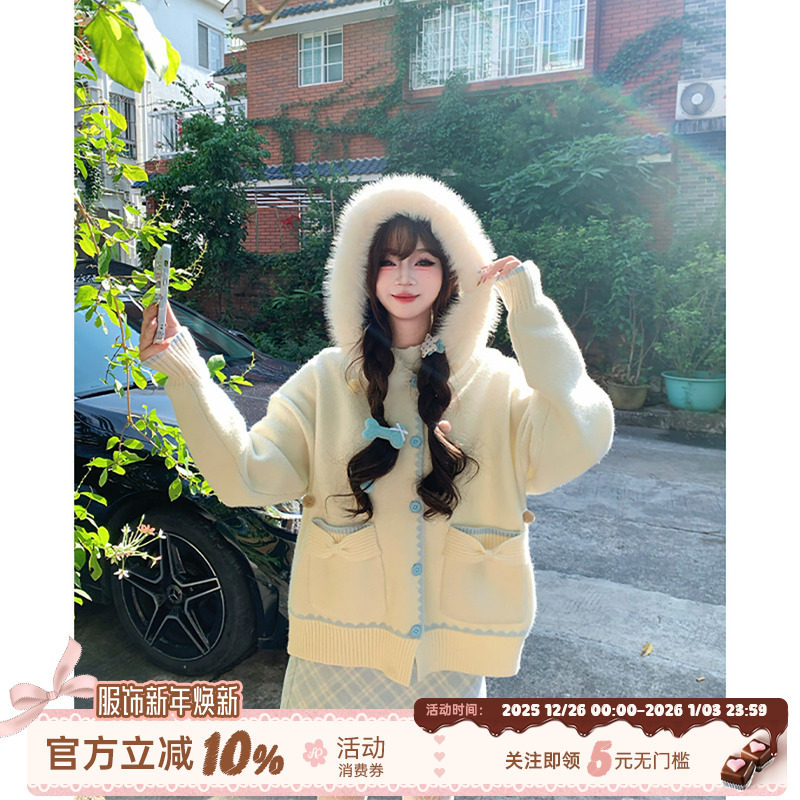 织物猪 奶油冰川 奶杏色连帽毛绒领外套女冬保暖慵懒针织开衫毛衣