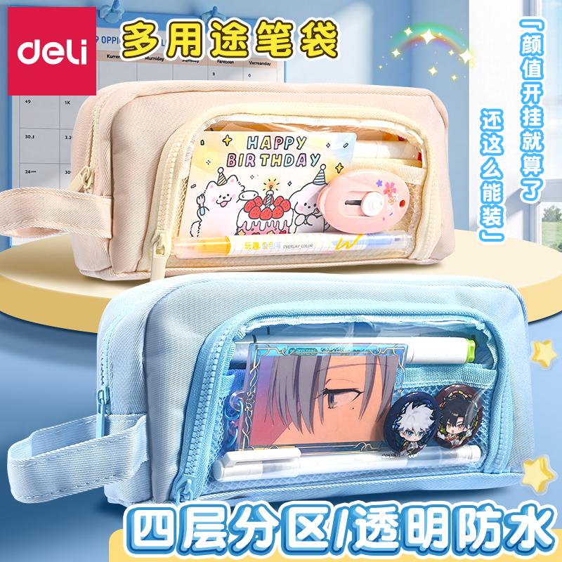 得力笔袋痛包大容量简约手提文具袋高颜值ins风可放吧唧小卡谷子收纳袋6层二次元新款男女孩痛层铅笔盒文具盒
