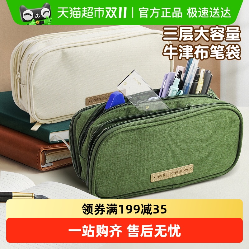 得力笔袋大容量初高中生女孩男孩多层高颜值加厚牛津布防水防磨三层五层文具袋子简约纯色多功能拉链式文具盒