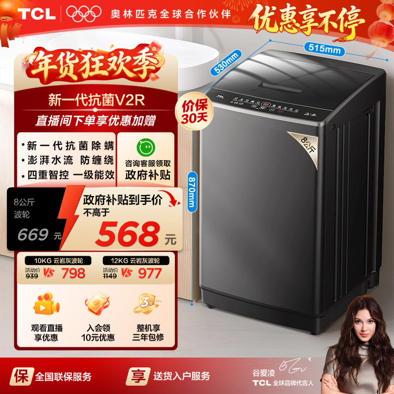 TCL 8/10/12KG波轮洗衣机V2R家用全自动抗菌除螨小型以旧换新补贴