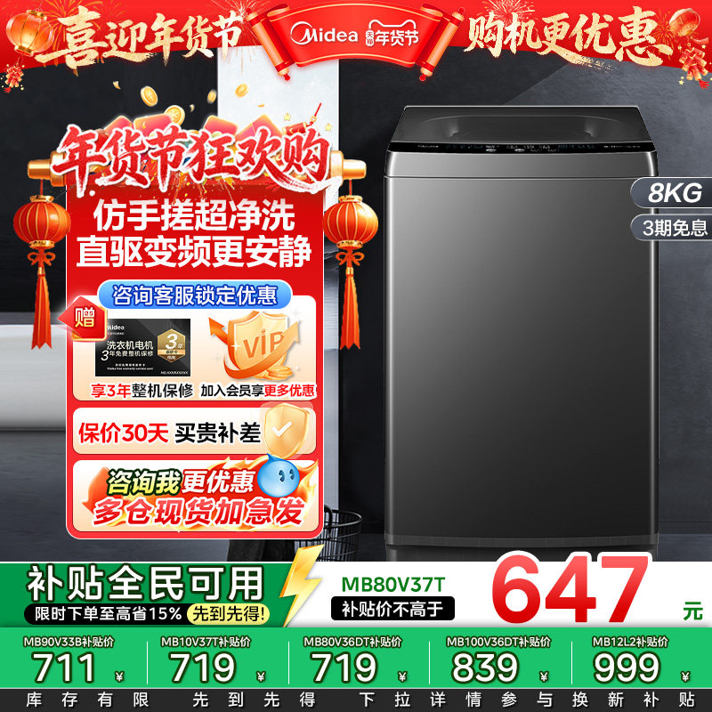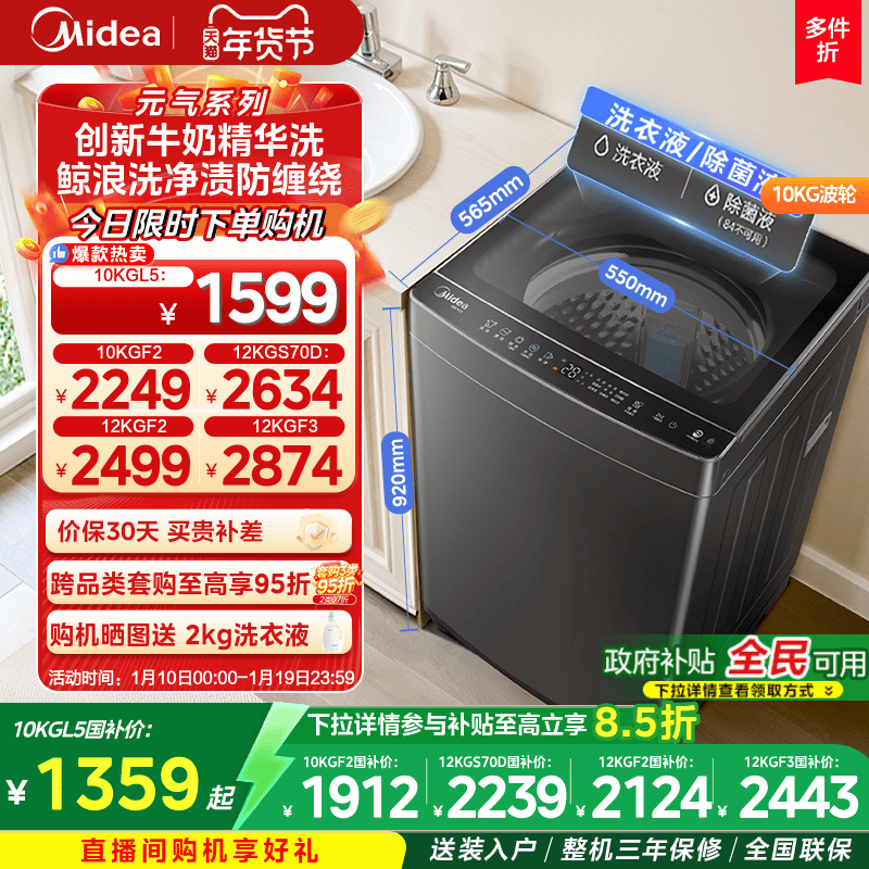 【全民补贴】美的直驱变频10公斤全自动家用大容量8kg波轮洗衣机