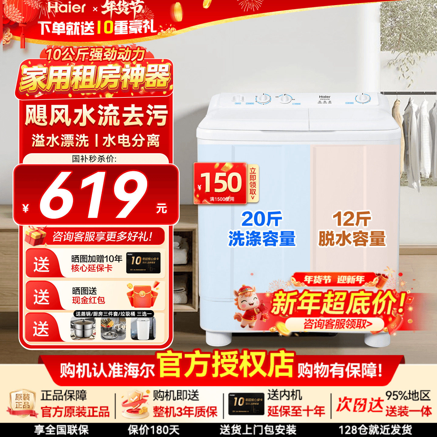 国补15%】海尔10/11kg半自动波轮洗衣机15公斤大容量双桶双筒双缸