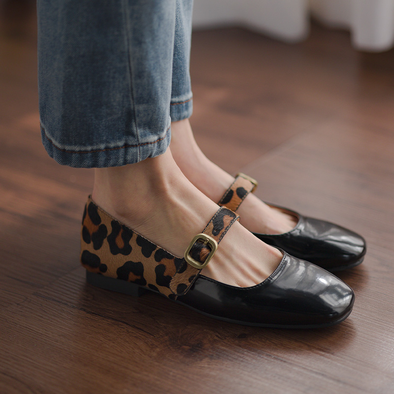 2025早春新款真皮浅口玛丽珍鞋平底复古赫本小皮鞋拼色单鞋女豹纹