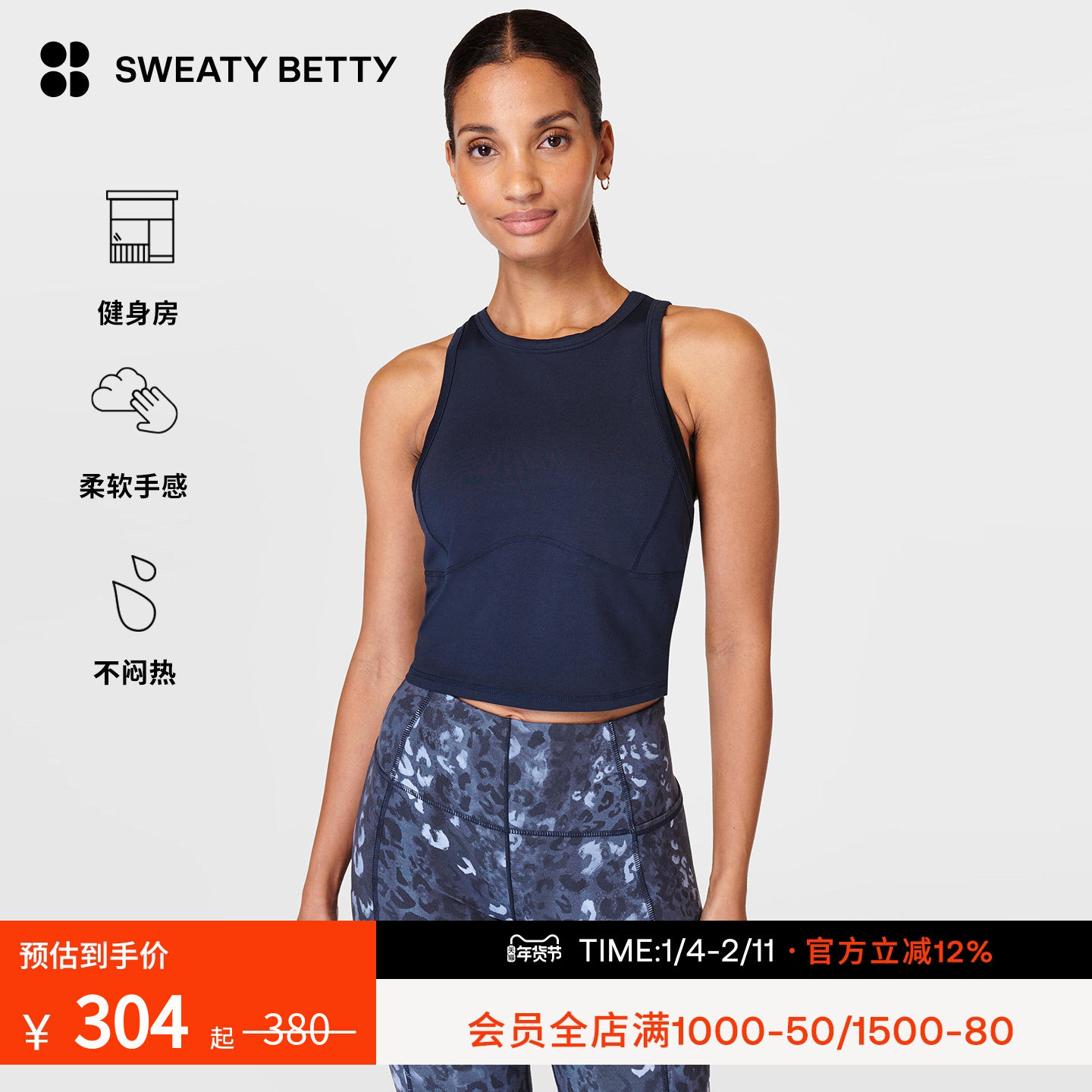 Sweaty Betty All Day不闷热弹性圆领短款运动健身背心女SB9593