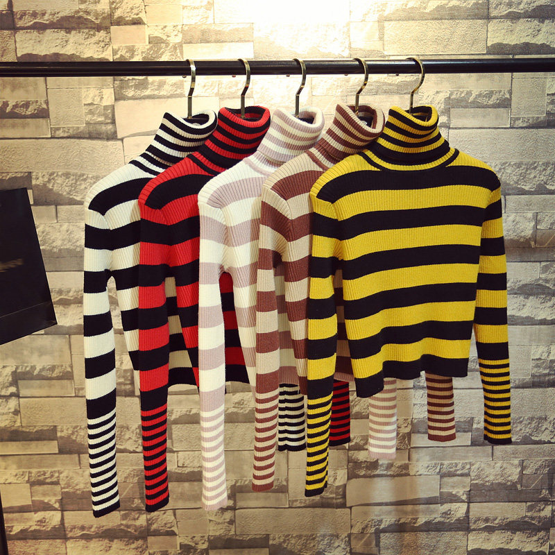 秋冬季韩版黑白条纹针织衫女长袖高领套头毛衣加厚短款打底上衣潮