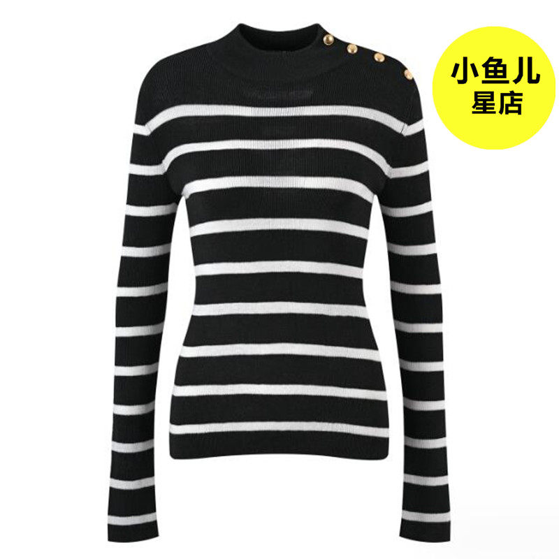 高端版 设计感气质He家肩扣打底衫女黑白海军条纹高领长袖针织衫