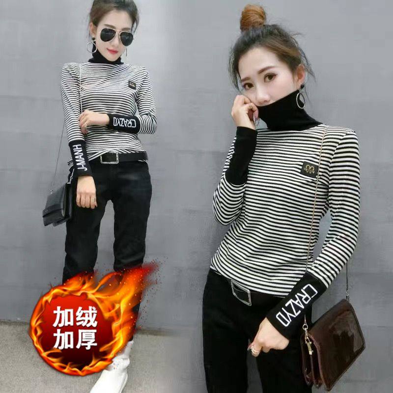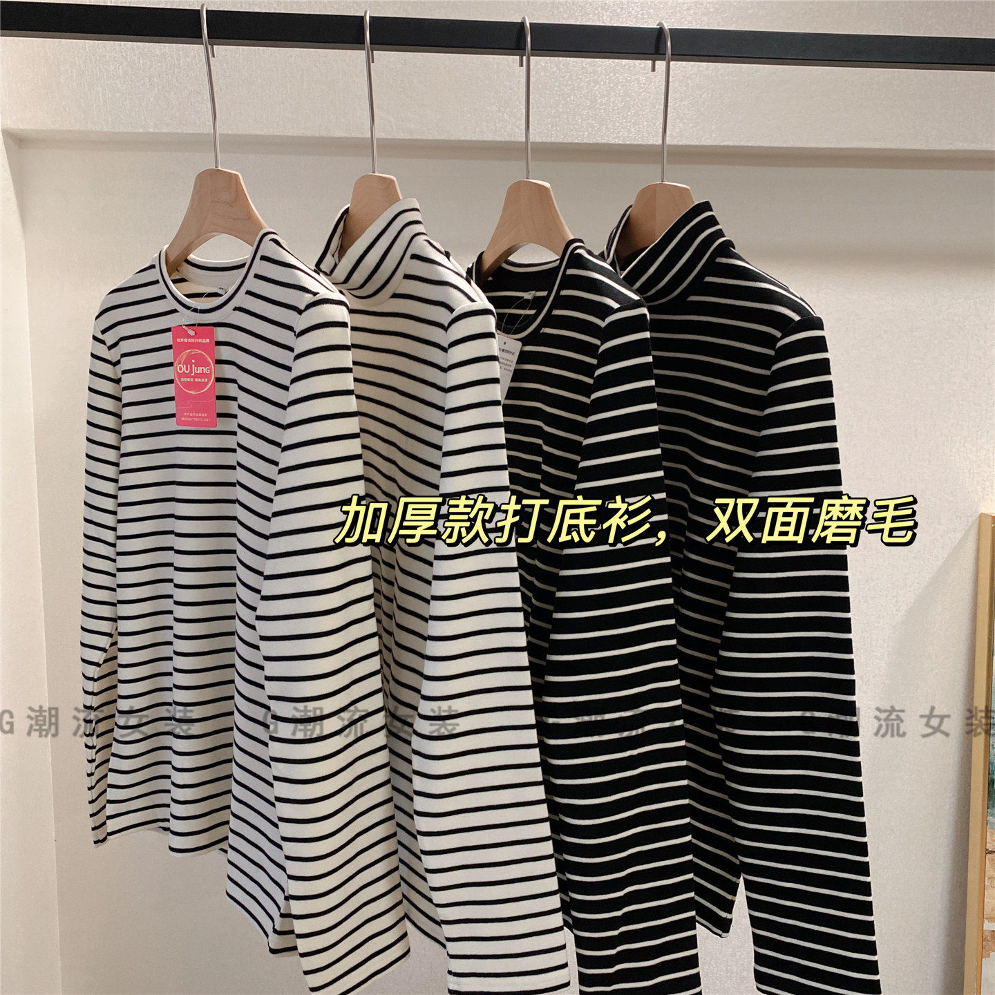 半高领黑白条纹打底衫女内搭加厚保暖磨毛长袖T恤秋冬修身上衣潮