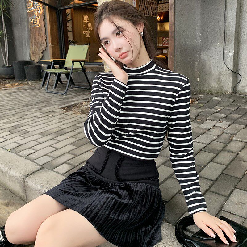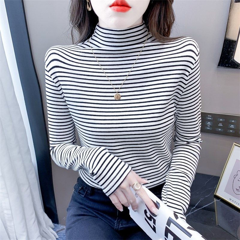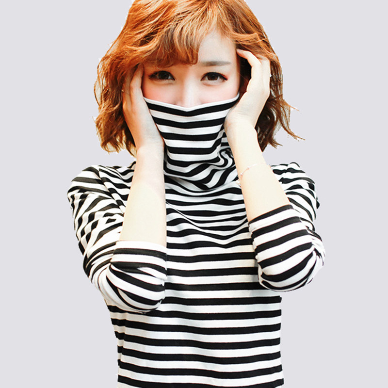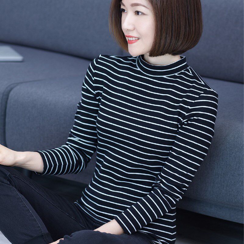 洛洛拉 半高领黑白条纹打底衫女秋新款韩版套头内搭磨毛长袖T恤潮