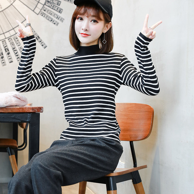 秋冬季半高领套头长袖针织打底衫韩版修身黑白条纹厚款打底毛衣女