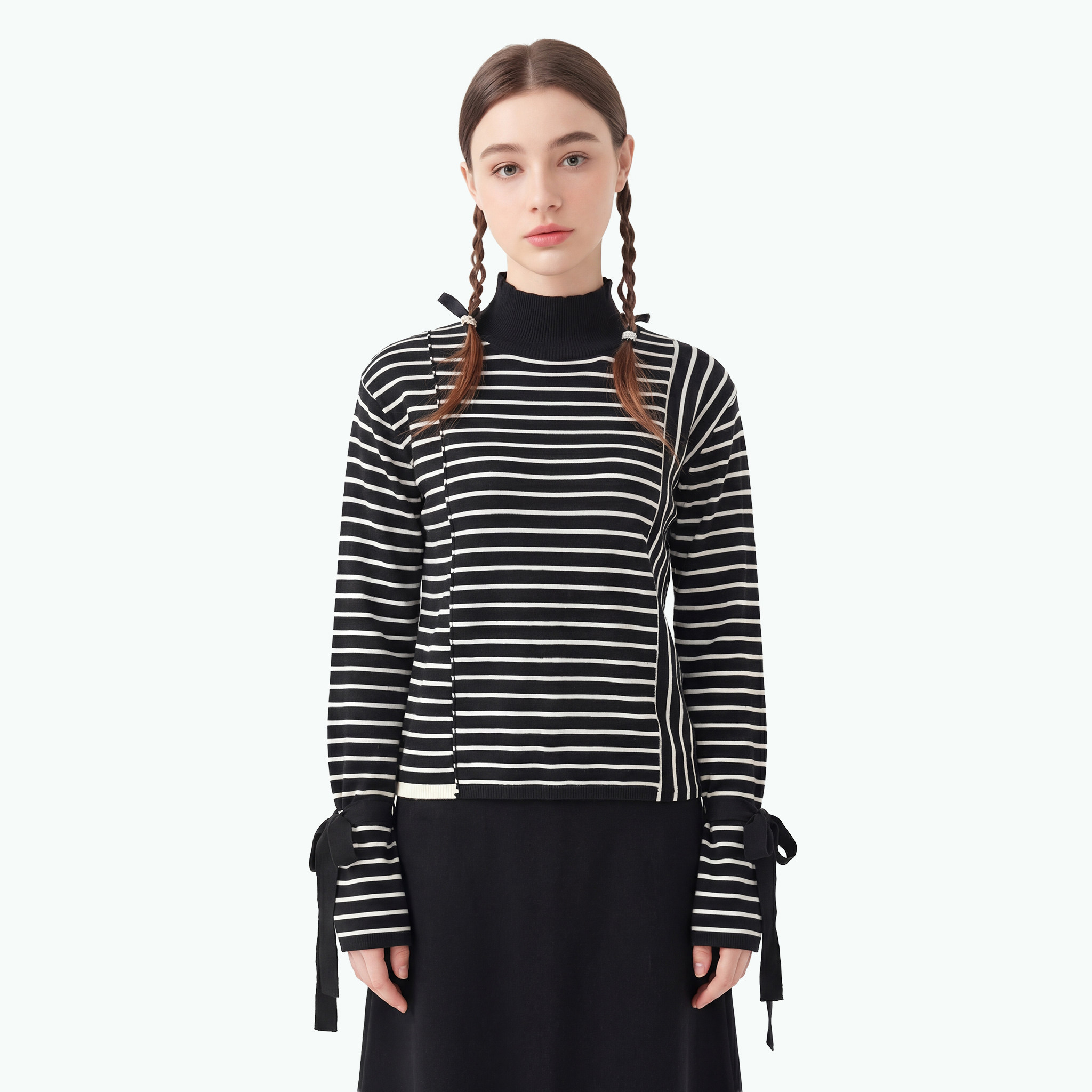 MMC法式复古高级感黑白条纹半高领针织衫小众设计拼接长袖毛衣女