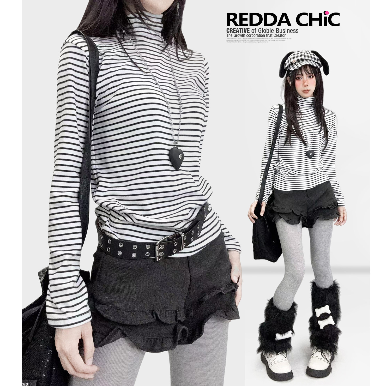 秋冬季亚文化黑白条纹打底衫半高领德绒长袖T恤亚比y2k内搭上衣女