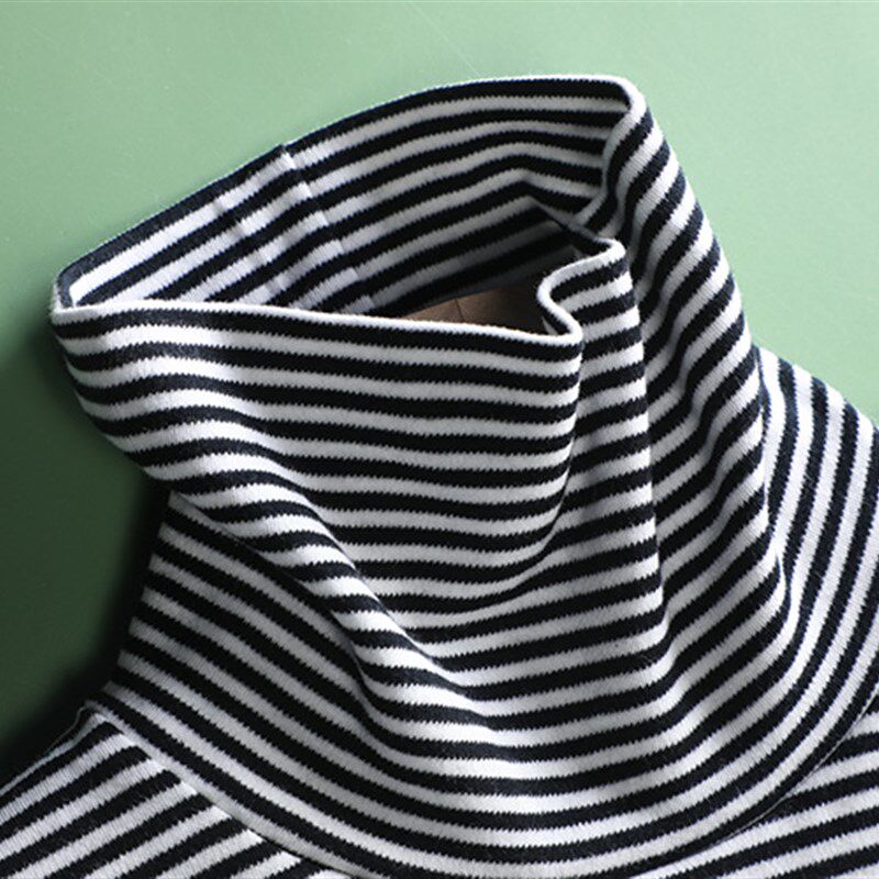 加密加厚磨毛舒适保暖撞色黑白条纹圆领高领长袖T恤打底衫秋冬女