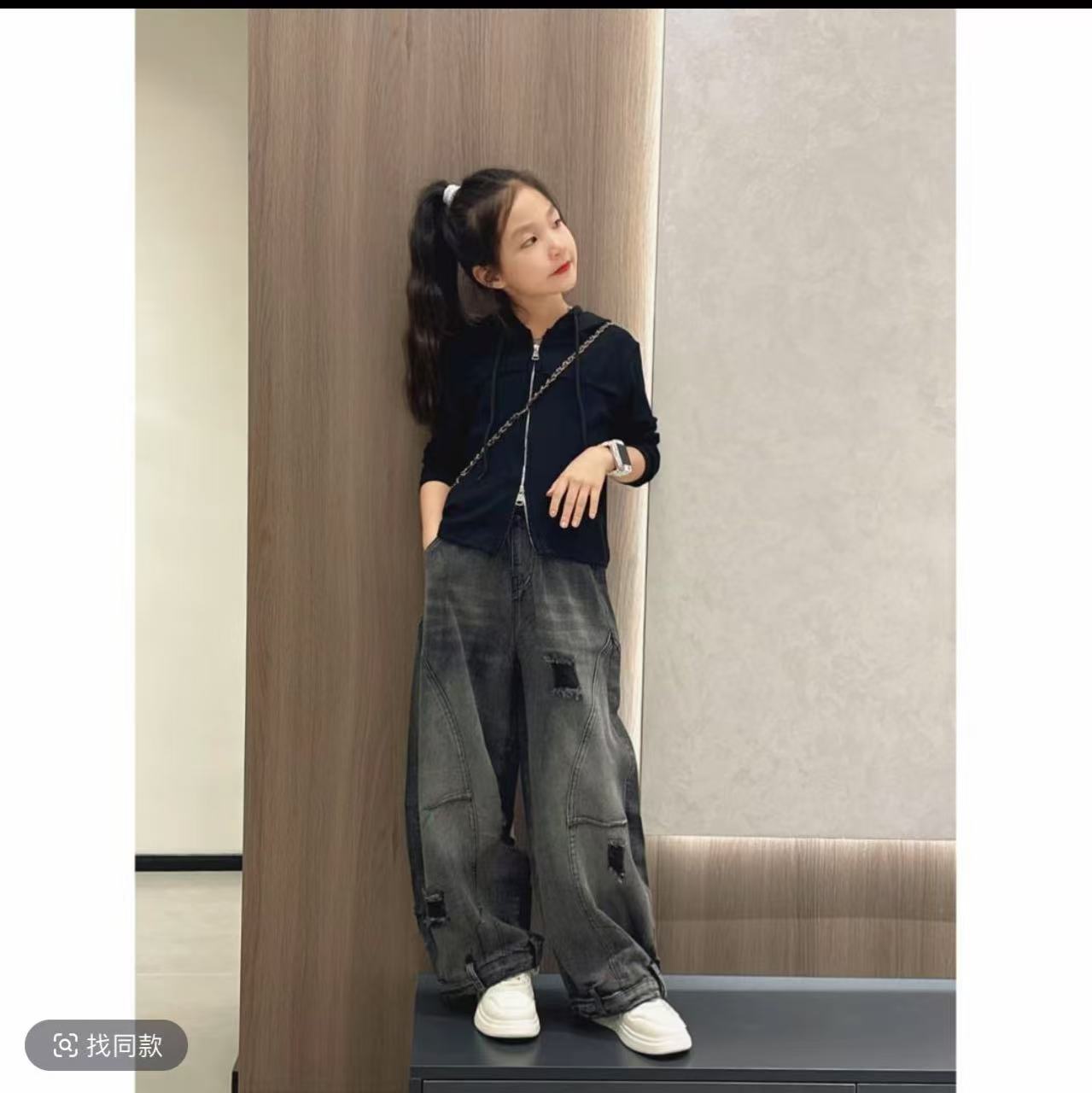 女童韩版长袖打底衫套装春秋新款网红中大童破洞牛仔阔腿裤两件套