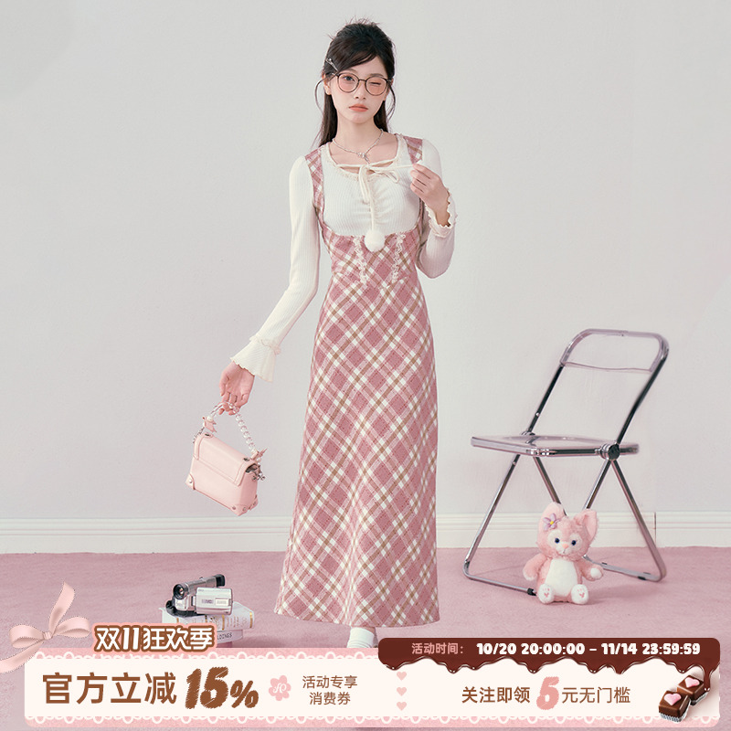 织物猪 绒球甜心 粉色假两件格纹连衣裙女秋冬内搭甜美气质长裙子