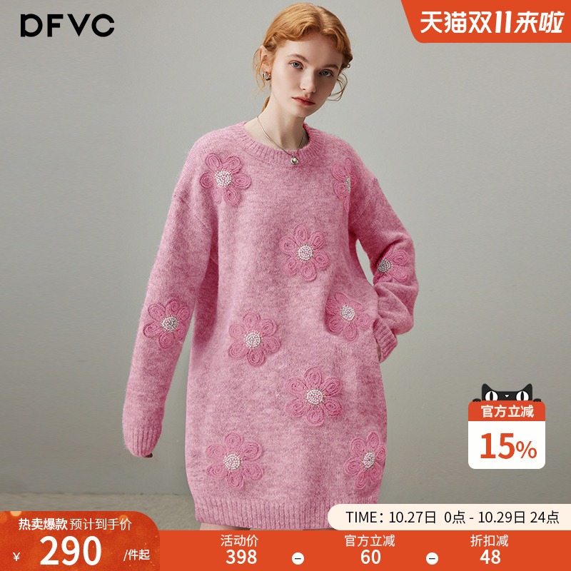 dfvc粉色羊毛圆领针织连衣裙女2025年秋季新款立体花朵慵懒风毛衣