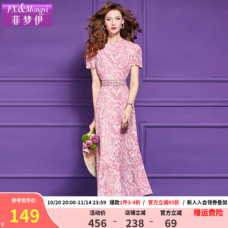 菲梦伊印花粉色连衣裙女短袖夏季法式轻熟优雅收腰衬衫中长款裙子