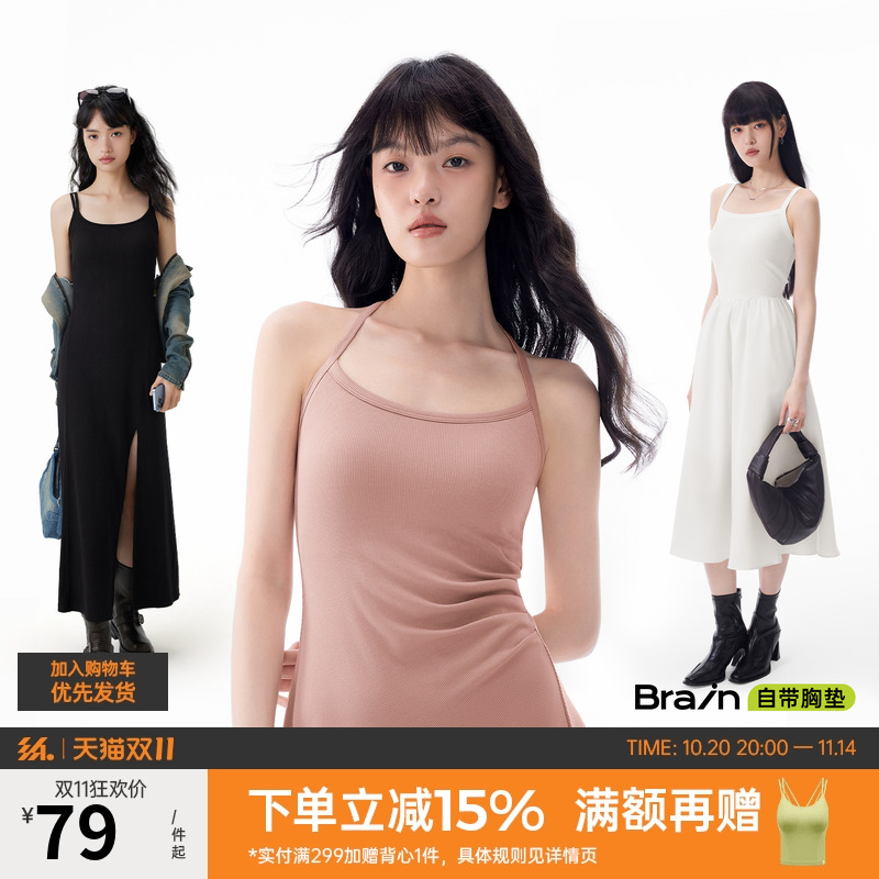 【papi同款】半练带胸垫吊带裙纯欲气质挂脖连衣裙黑裙子粉色长裙