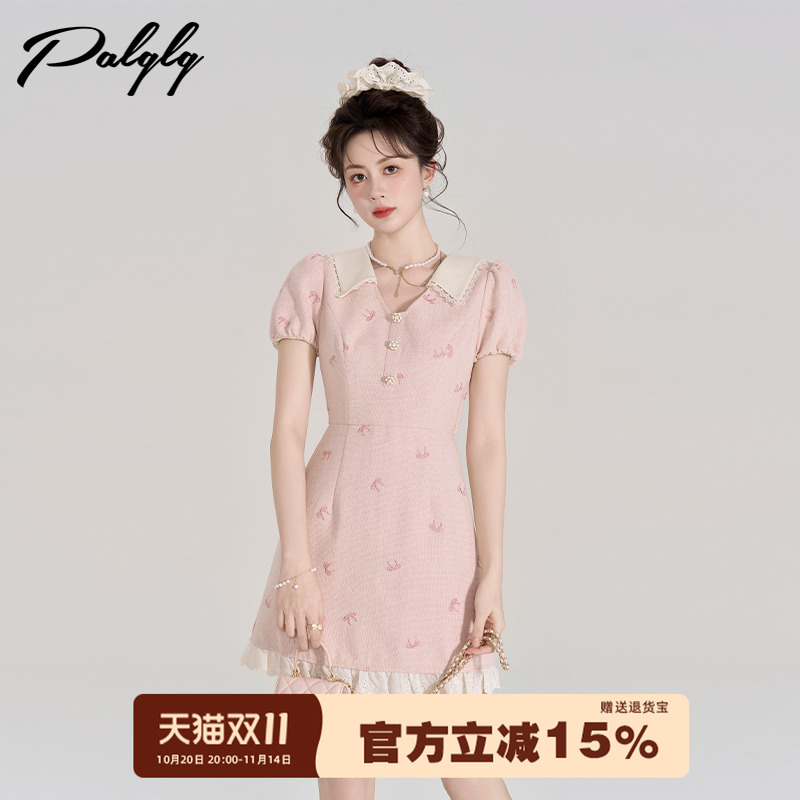 小香风粉色v领短袖连衣裙女夏季高级感蕾丝花边法式小个子甜美裙