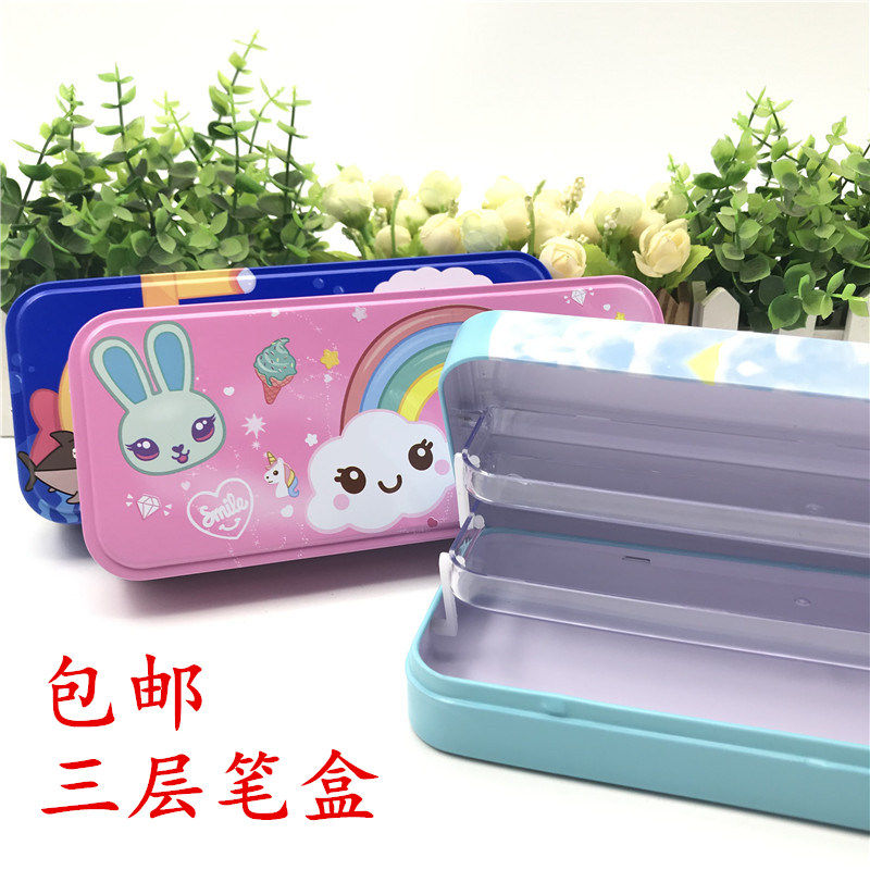 可爱卡通创意文具盒幼儿园儿童三层大容量铁笔盒小学生双层铅笔盒