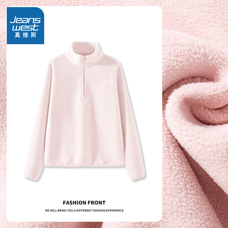 班尼路粉色摇粒绒卫衣女2025秋冬新款保暖宽松半拉链立领上衣女Q