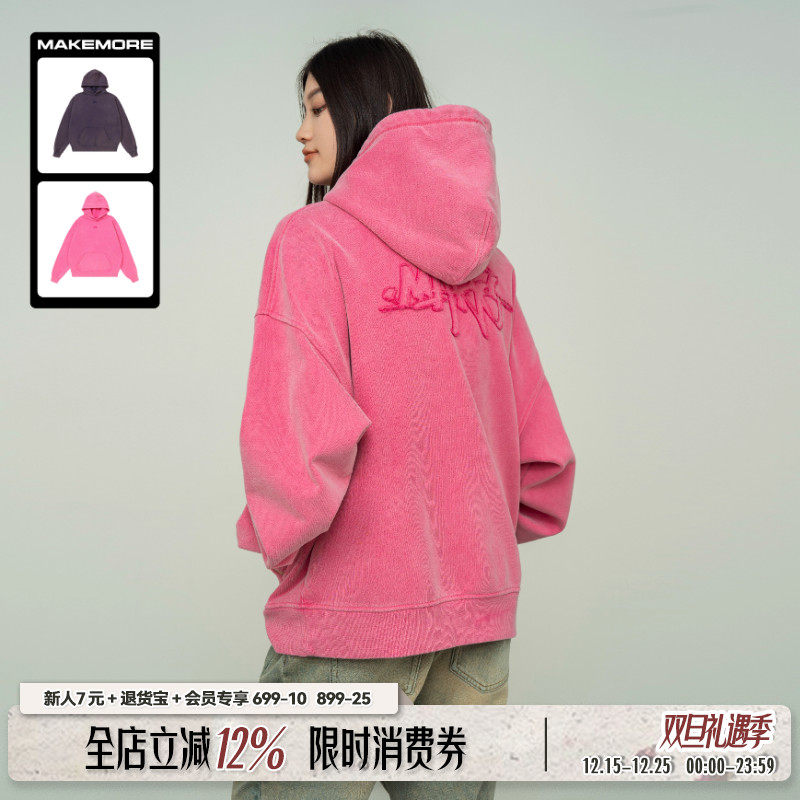 Makemore卫衣男秋季新款水洗粉色刺绣重磅美式潮流情侣连帽上衣女
