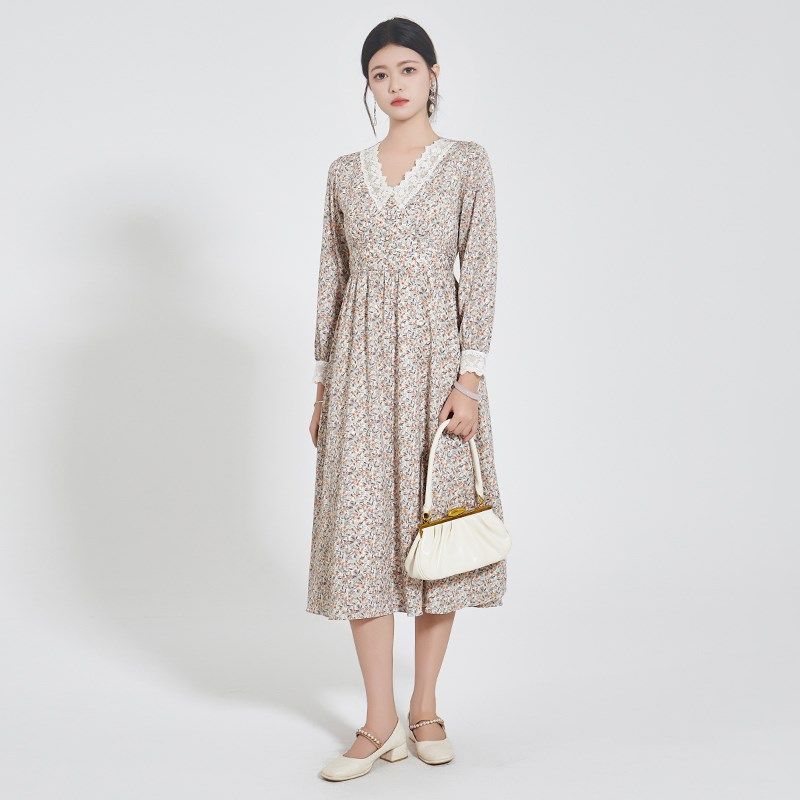 固执复古长袖碎花V领中长款雪纺连衣裙32813LQ06668