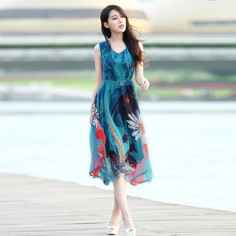 沙滩裙女夏2021新款海边度假巴厘岛中长款雪纺连衣裙波西米亚显瘦