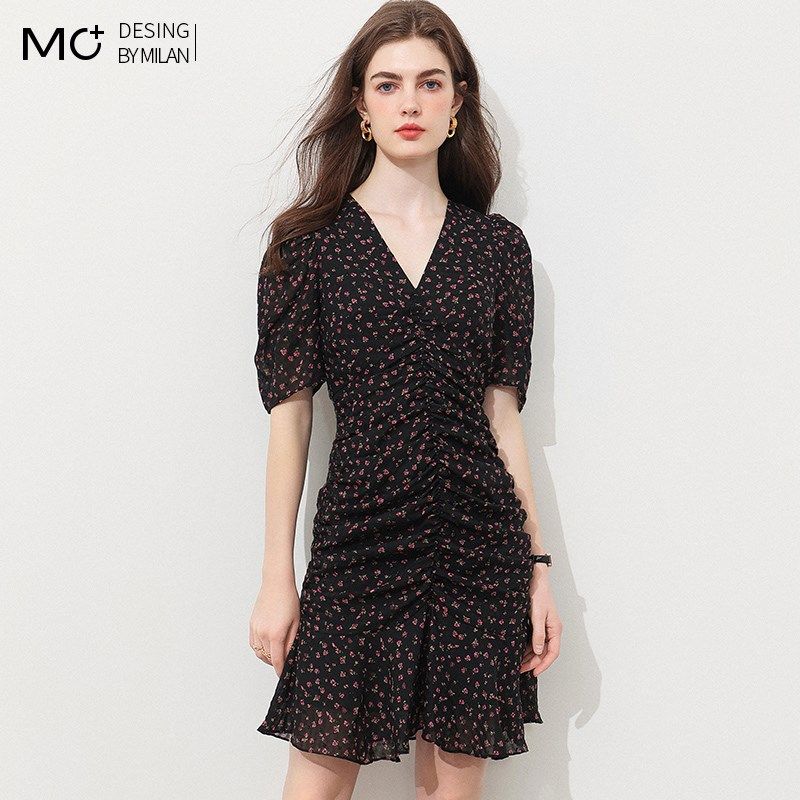 SOMSOM/索玛中长款雪纺连衣裙夏季法式V领印花开叉A字短袖茶歇裙
