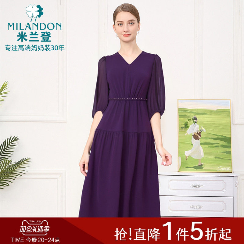 米兰登中老年妈妈装2025年夏季新款V领气质中长款雪纺连衣裙女潮