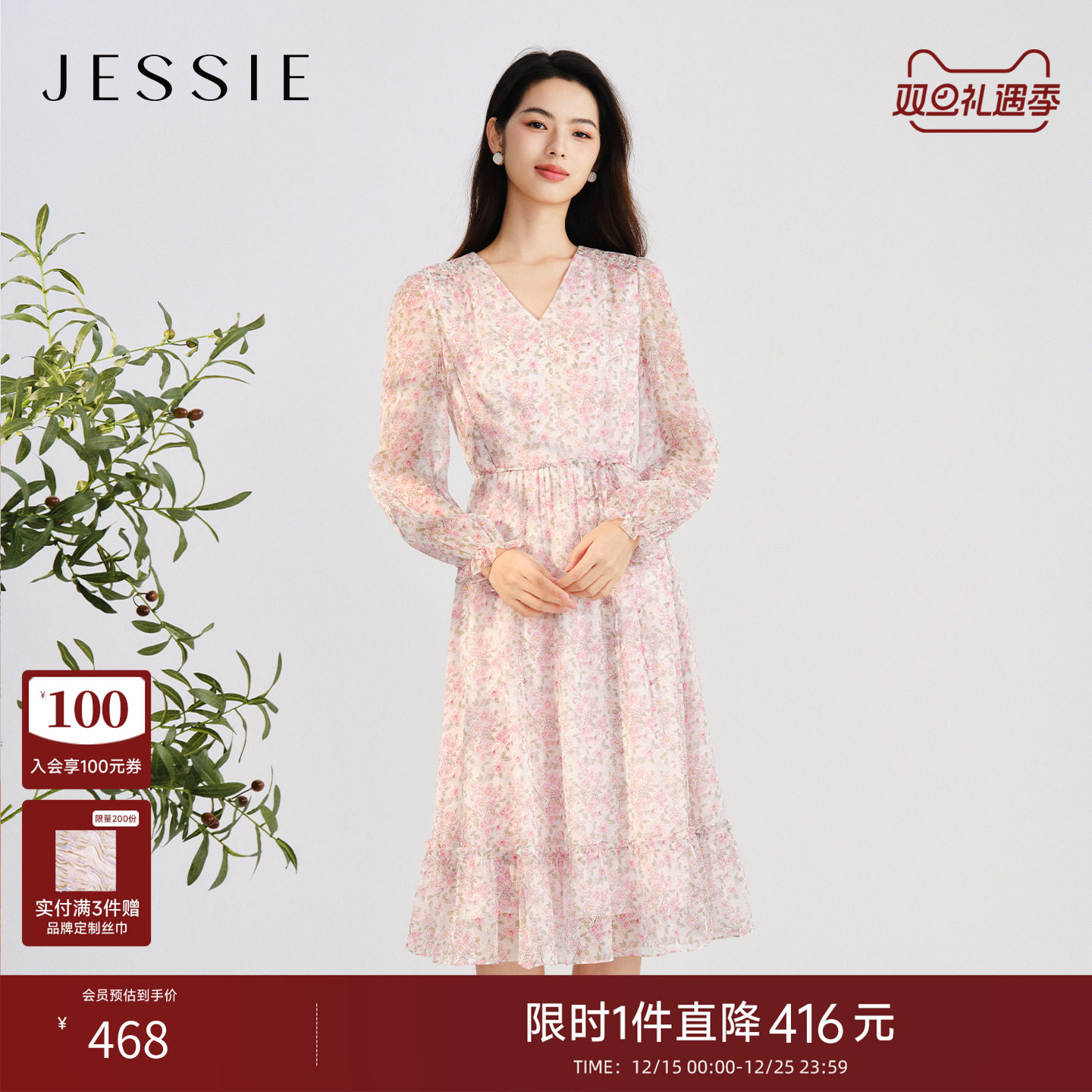 JESSIE减龄粉色碎花V领中长款雪纺连衣裙春新款系带收腰显瘦长袖