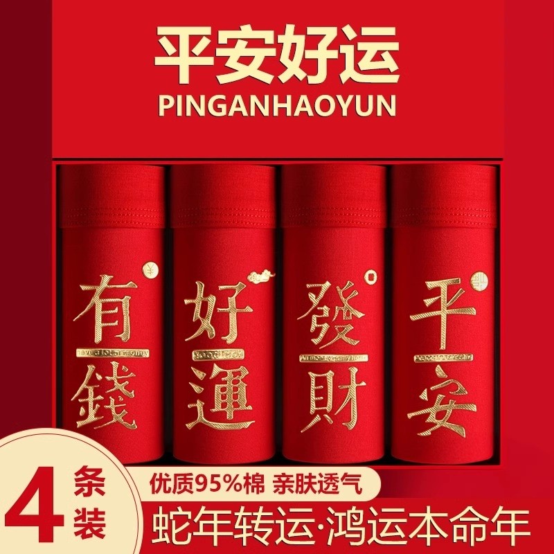 本命年男士红色内裤男生平角裤抗菌大红色结婚属码四角短裤礼盒装
