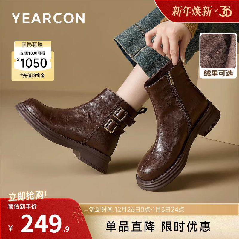 意尔康女鞋2025冬季法式短靴女粗跟气质英伦风加绒女靴舒适及踝靴